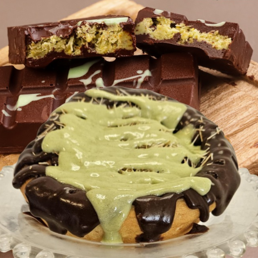 Chocolate Buttercream layered with knafeh and pistachio cream over a gourmet cinnamon roll. This is a NEW must-try Cinnamom favorite!