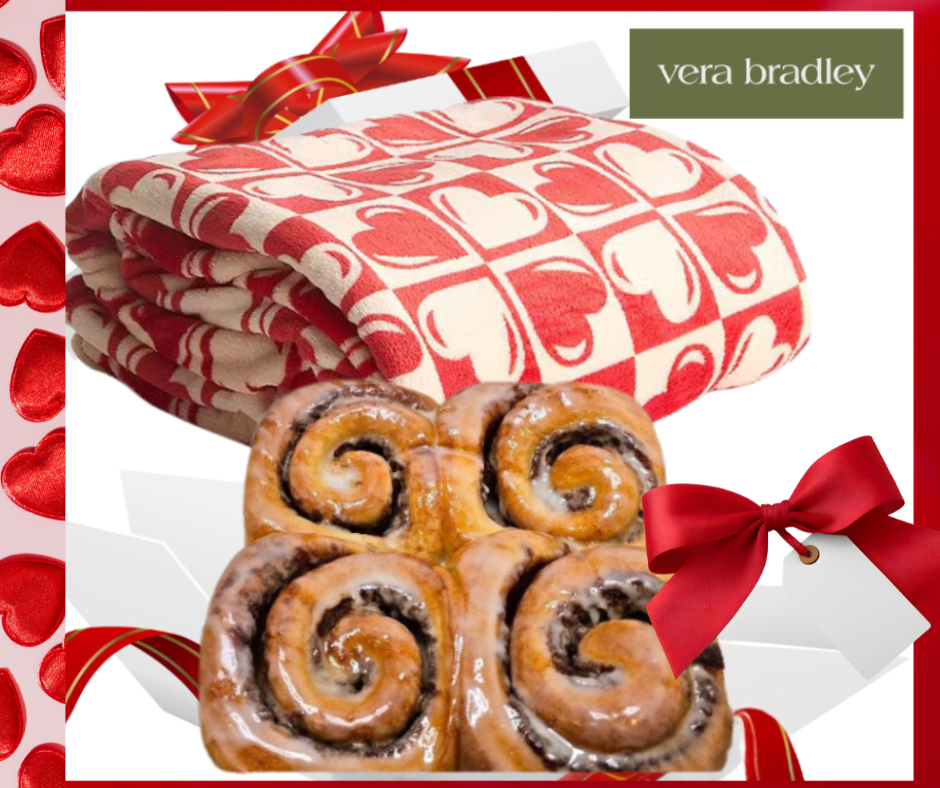 This seasonal combo gift set features Mom’s traditional hand-rolled cinnamon rolls with old-fashioned “traditional glaze” topping plus a beautiful Vera Bradley Valentine-inspired blanket throw. This gift set is sure to delight all your loved ones!