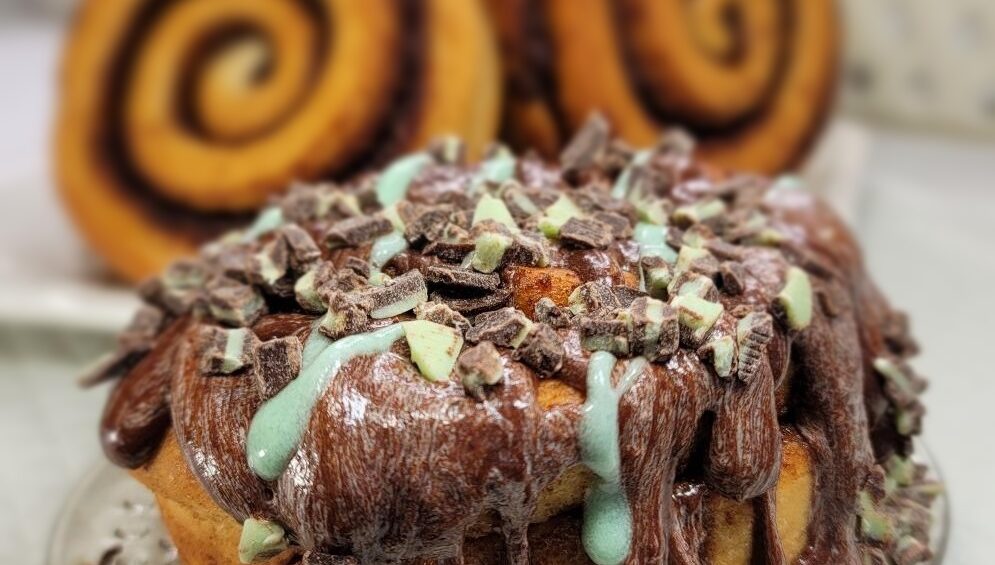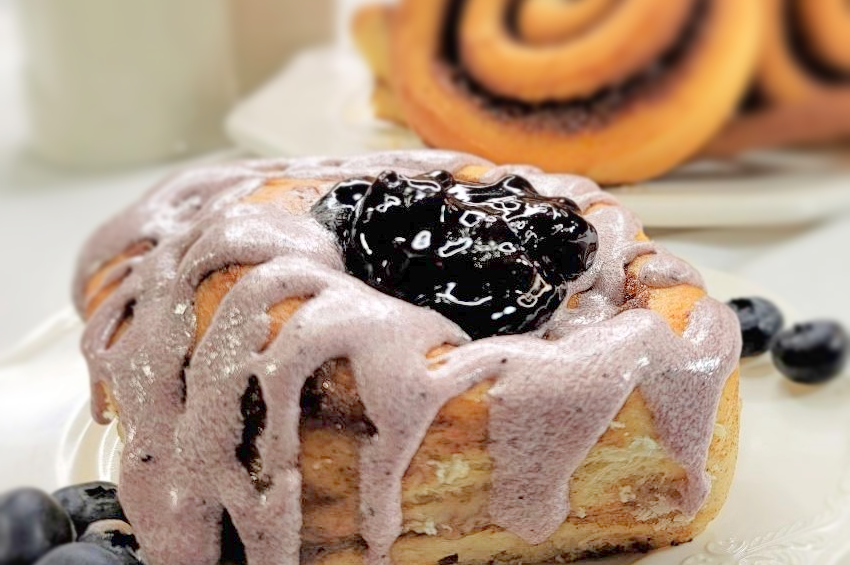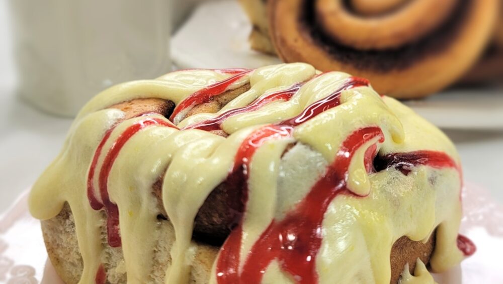 Gourmet Cinnamon rolls with flavors of smooth classic peanut butter frosting and strawberry jelly on top. Lip smacking yummy!